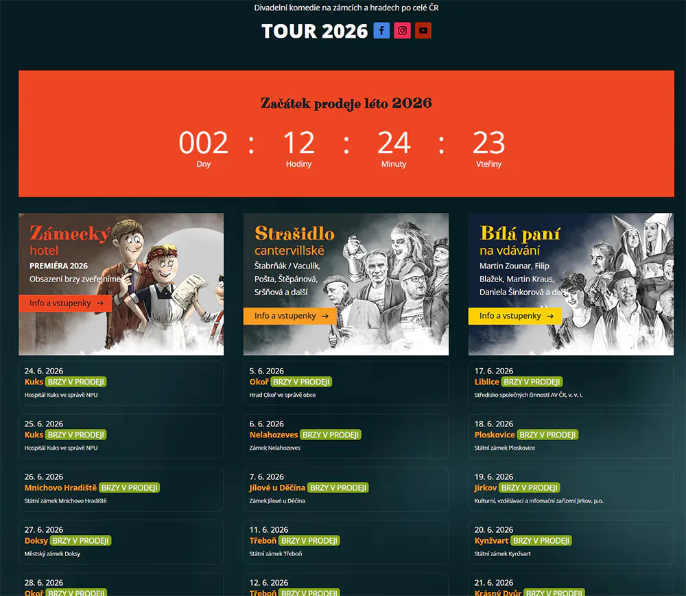 Divadelní komedie se vracejí na zámky a hrady po celé České republice. TOUR 2026 přiveze tři oblíbené tituly do nejkrásnějších historických kulis – a start prodeje vstupenek je doslova za dveřmi. Všechny zastávky jsou nyní označeny „BRZY V PRODEJI“ a web odpočítává poslední dny a hodiny do spuštění.